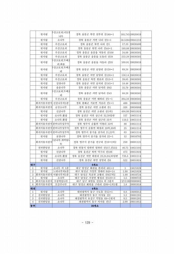 129 원시림 우산고로쇠,너도밤 나무 경북 울릉군 북면 천부리 산189-1 105.74520020810 원시림 소나무 경북 울릉군 서면 나리 산2-1 50.520420041218 원시림 우산고로쇠 경북 울릉군 북면 나리 산1 17.33 20030400 원시림 우산고로쇠 경북 울릉군 북면 나리 산44-1 193.99 20030501 원시림 우산고로쇠 경북 울릉군 울릉읍 저동리 산109 34.00 20030501 원시림 우산고로쇠 경북 울릉군 울릉읍 도동리 산39 233.29 20030501 원시림 우산고로쇠,두메오 리,회솔 경북 울릉군 울릉읍 사동리 산35 169.91 20020810 원시림 우산고로쇠,두메오 리 경북 울릉군 서면 남양리 산128-2 69.34 20020810 원시림 우산고로쇠 경북 울릉군 서...