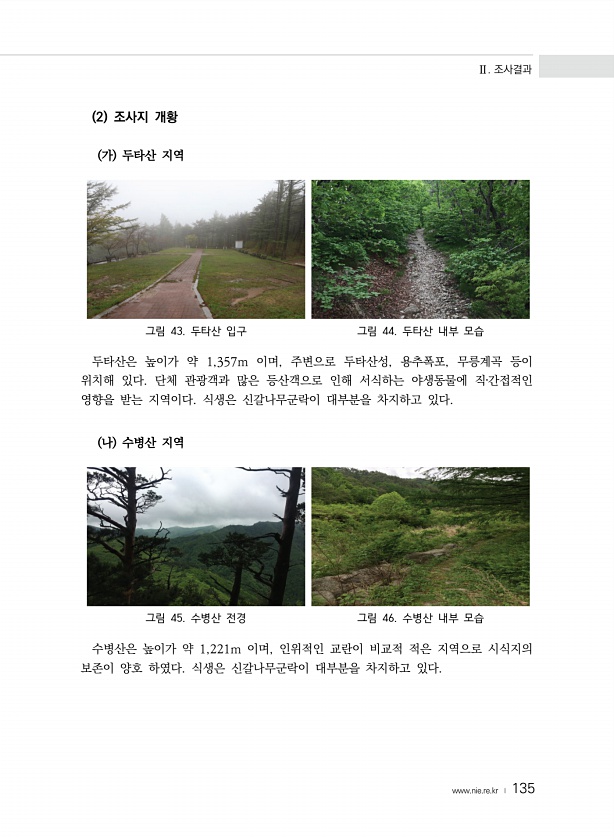 Ⅱ. 조사결과 www.nie.re.kr ? 135 2 조사지 개황 가 두타산 지역 그림 43. 두타산 입구 그림 44. 두타산 내부 모습 두타산은 높이가 약 1,357m 이며, 주변으로 두타산성, 용추폭포, 무릉계곡 등이 위치해 있다. 단체 관광객과 많은 등산객으로 인해 서식하는 야생동물에 직?간접적인 영향을 받는 지역이다. 식생은 신갈나무군락이 대부분을 차지하고 있다. 나 수병산 지역 그림 45. 수병산 전경 그림 46. 수병산 내부 모습 수병산은 높이가 약 1,221m 이며, 인위적인 교란이 비교적 적은 지역으로 시식지의 보존이 양호 하였다. 식생은 신갈나무군락이 대부분을 차지하고있다.