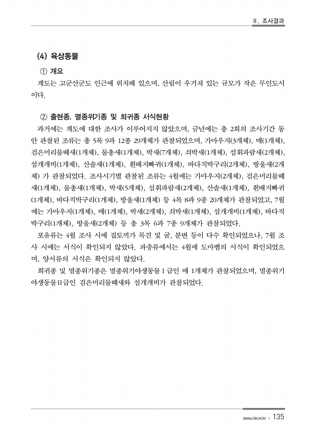 Ⅱ. 조사결과 www.nie.re.kr ? 135 4 육상동물 ① 개요 계도는 고군산군도 인근에 위치해 있으며, 산림이 우거져 있는 규모가 작은 무인도서 이다. ② 출현종, 멸종위기종 및 희귀종 서식현황 과거에는 계도에 대한 조사가 이루어지지 않았으며, 금년에는 총 2회의 조사기간 동 안 관찰된 조류는 총 5목 9과 12종 29개체가 관찰되었으며, 가마우지 3개체 , 매 1개체 , 검은머리물떼새 1개체 , 물총새 1개체 , 박새 7개체 , 쇠박새 1개체 , 섬휘파람새 2개체 , 섬개개비 1개체 , 산솔새 1개체 , 흰배지빠귀 1개체 , 바다직박구리 2개체 , 방울새 2개 체 가 관찰되었다. 조사시기별 관찰된 조류는 4월에는 가마우지 2개체 , 검은머리물떼 새 1개체 , 물총새 1개체 , 박새 5개체 , 섬휘...