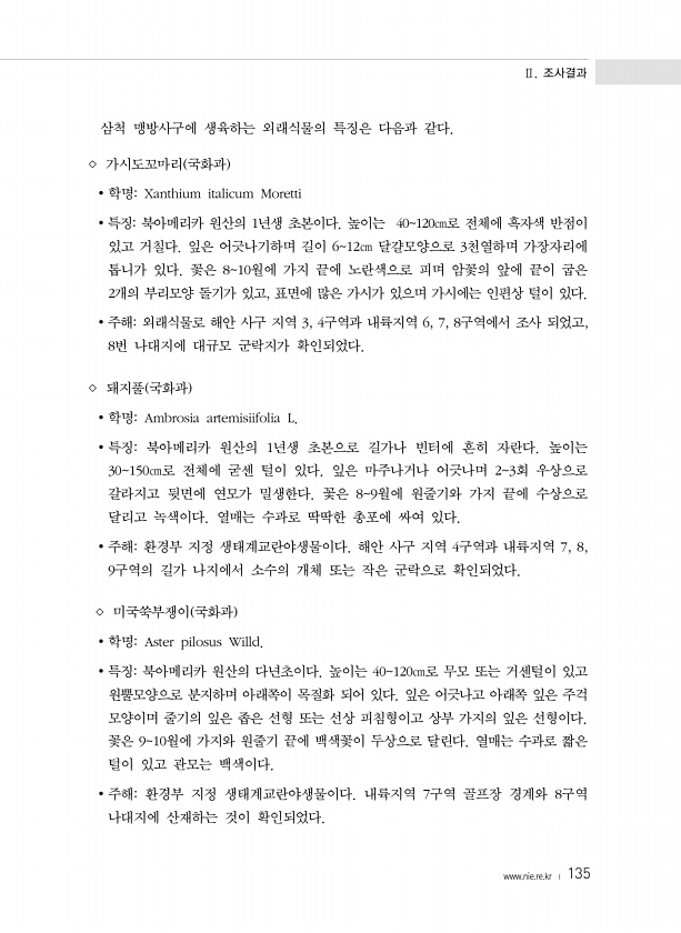 Ⅱ. 조사결과 www.nie.re.kr ? 135 삼척 맹방사구에 생육하는 외래식물의 특징은 다음과 같다. ◇ 가시도꼬마리 국화과 ? 학명Xanthium italicum Moretti ? 특징북아메리카 원산의 1년생 초본이다. 높이는 40120㎝로 전체에 흑자색 반점이 있고 거칠다. 잎은 어긋나기하며 길이 612㎝ 달걀모양으로 3천열하며 가장자리에 톱니가 있다. 꽃은 810월에 가지 끝에 노란색으로 피며 암꽃의 앞에 끝이 굽은 2개의 부리모양 돌기가 있고, 표면에 많은 가시가 있으며 가시에는 인편상 털이 있다. ? 주해외래식물로 해안 사구 지역 3, 4구역과 내륙지역 6, 7, 8구역에서 조사 되었고, 8번 나대지에 대규모 군락지가 확인되었다. ◇ 돼지풀 국화과 ? 학명Ambrosia artemisiifol...