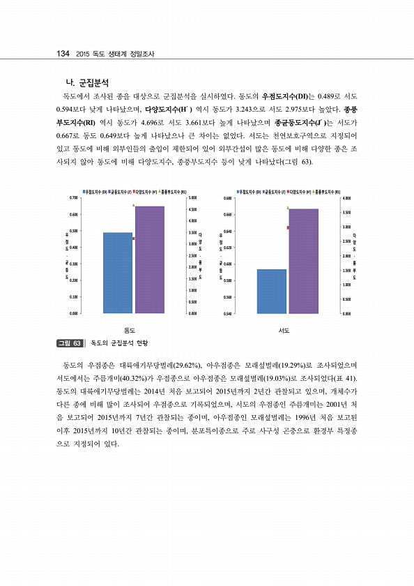 134 2015 독도 생태계 정밀조사 나. 군집분석 독도에서 조사된 종을 대상으로 군집분석을 실시하였다. 동도의 우점도지수 DI 는 0.489로 서도 0.594보다 낮게 나타났으며, 다양도지수 H′ 역시 동도가 3.243으로 서도 2.975보다 높았다. 종풍 부도지수 RI 역시 동도가 4.696로 서도 3.661보다 높게 나타났으며 종균등도지수 J′ 는 서도가 0.667로 동도 0.649보다 높게 나타났으나 큰 차이는 없었다. 서도는 천연보호구역으로 지정되어 있고 동도에 비해 외부인들의 출입이 제한되어 있어 외부간섭이 많은 동도에 비해 다양한 종은 조 사되지 않아 동도에 비해 다양도지수, 종풍부도지수 등이 낮게 나타났다 그림 63 0.000 0.500 1.000 1.500 2.000 2.500 3.000 3...