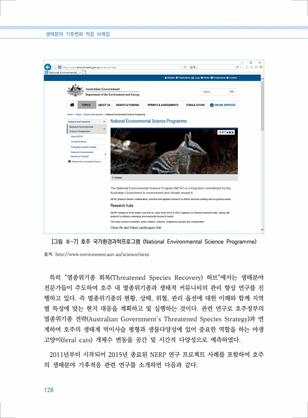 생태분야 기후변화 적응 사례집 128 [그림 Ⅲ-7] 호주 국가환경과학프로그램 National Environmental Science Programme 출처http//www.environment.gov.au/science/nesp 특히 “멸종위기종 회복 Threatened Species Recovery 허브”에서는 생태분야 전문가들이 주도하여 호주 내 멸종위기종과 생태적 커뮤니티의 관리 향상 연구를 진 행하고 있다. 즉 멸종위기종의 현황, 상태, 위협, 관리 옵션에 대한 이해와 함께 지역 별 특성에 맞는 현지 대응을 계획하고 및 실행하는 것이다. 관련 연구로 호주정부의 멸종위기종 전략 Australian Government’s Threatened Species Strategy 과 연 계하여 호주의 생태계 먹...
