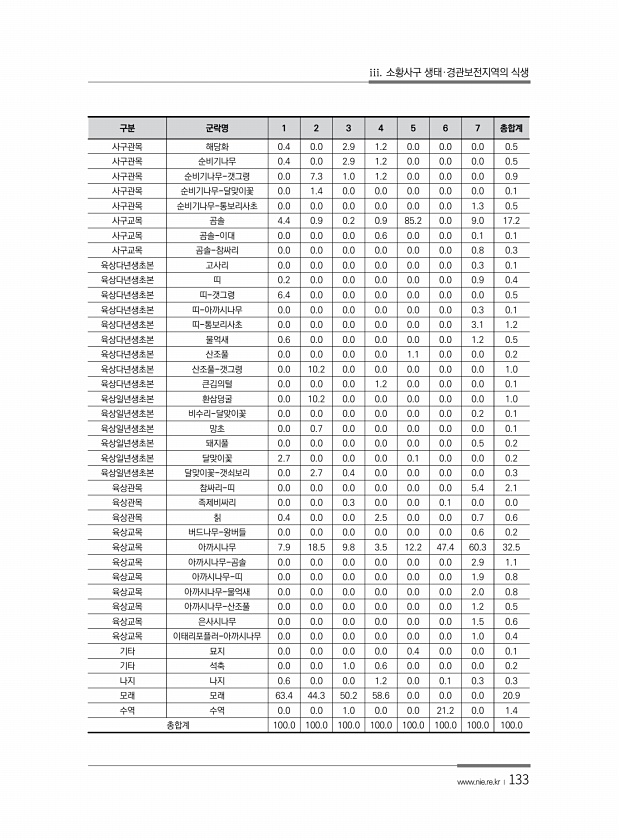 iii. 소황사구 생태·경관보전지역의 식생 www.nie.re.kr ?133 구분 군락명 1 2 3 4 5 6 7 총합계 사구관목 해당화 0.4 0.0 2.9 1.2 0.0 0.0 0.0 0.5 사구관목 순비기나무 0.4 0.0 2.9 1.2 0.0 0.0 0.0 0.5 사구관목 순비기나무-갯그령 0.0 7.3 1.0 1.2 0.0 0.0 0.0 0.9 사구관목 순비기나무-달맞이꽃 0.0 1.4 0.0 0.0 0.0 0.0 0.0 0.1 사구관목 순비기나무-통보리사초 0.0 0.0 0.0 0.0 0.0 0.0 1.3 0.5 사구교목 곰솔 4.4 0.9 0.2 0.9 85.2 0.0 9.0 17.2 사구교목 곰솔-이대 0.0 0.0 0.0 0.6 0.0 0.0 0.1 0.1 사구교목 곰솔-참싸리 0.0 0.0...