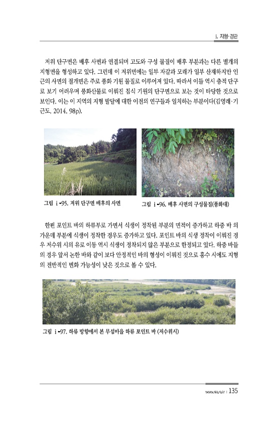 i. 지형·경관 www.nie.re.kr ?135 저위 단구면은 배후 사면과 연결되며 고도와 구성 물질이 배후 부분과는 다른 별개의 지형면을 형성하고 있다. 그런데 이 저위면에는 일부 자갈과 모래가 일부 산재하지만 인 근의 사면의 절개면은 주로 풍화 기원 물질로 이루어져 있다. 따라서 이들 역시 충적 단구 로 보기 어려우며 풍화산물로 이뤄진 침식 기원의 단구면으로 보는 것이 타당한 것으로 보인다. 이는 이 지역의 지형 발달에 대한 이전의 연구들과 일치하는 부분이다 김영래·기 근도, 2014, 98p 그림 ⅰ-95. 저위 단구면 배후의 사면 그림 ⅰ-96. 배후 사면의 구성물질 풍화대 한편 포인트 바의 하류부로 가면서 식생이 정착된 부분의 면적이 증가하고 하중 바 의 가운데 부분에 식생이 정착한 경우도 증가하...