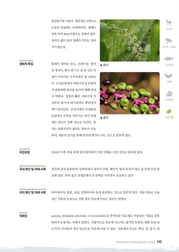 포유류 양서류 · 파충류 담수어류 곤충류 연체동물 외래식물 Imformation on Alien Species in Korea 145 총상화서를 이룬다. 꽃받침은 5개이고 수술과 암술대는 10개씩이다. 열매는 장과 이며 3mm가량으로 광택이 있다. 심피가 붙어 있어 열매가 익어도 갈라 지지 않는다. 생태적 특징 화재가 일어난 장소, 쓰레기장, 방치 된 경작지, 빛이 잘 드는 숲 등 인간 간 섭이 이루어진 서식처에서 잘 나타난 다. 산성토양에서 약알카리성 토양까 지 광범위한 분포를 보이며 염해 내성 이 약하다. 성장이 빠른 식물이며 지 상부의 줄기가 제거되어도 뿌리에서 싹이 돋아난다. 공장지대의 산성화된 토양에서 군락을 이루기도 하여 공해 에도 내성이 강한 것으로 보인다. 종 자는 춘화처리가 없어도 발아가 가...
