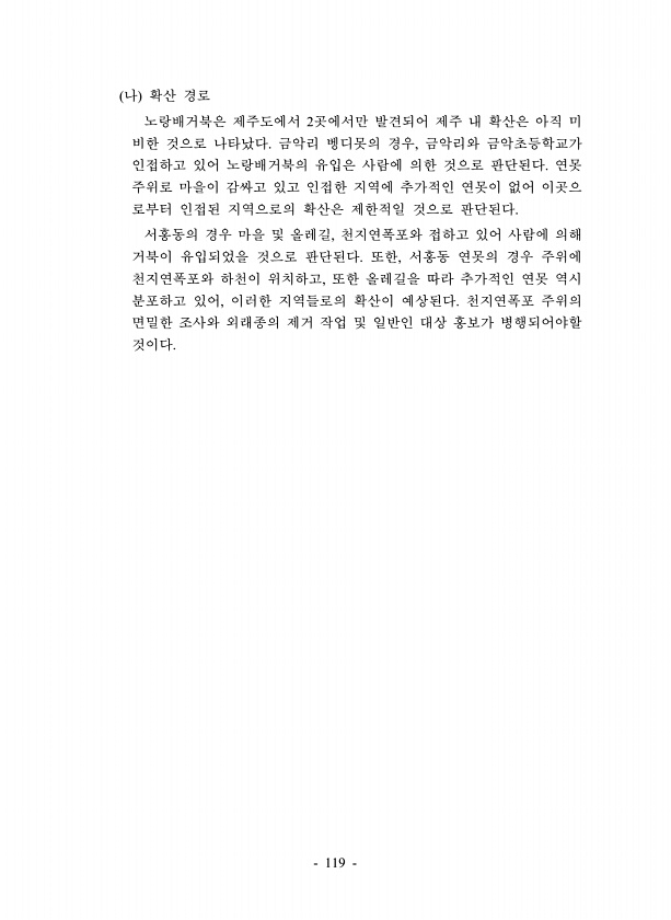 119 나 확산 경로 노랑배거북은 제주도에서 2곳에서만 발견되어 제주 내 확산은 아직 미 비한 것으로 나타났다. 금악리 벵디못의 경우, 금악리와 금악초등학교가 인접하고 있어 노랑배거북의 유입은 사람에 의한 것으로 판단된다. 연못 주위로 마을이 감싸고 있고 인접한 지역에 추가적인 연못이 없어 이곳으 로부터 인접된 지역으로의 확산은 제한적일 것으로 판단된다. 서홍동의 경우 마을 및 올레길, 천지연폭포와 접하고 있어 사람에 의해 거북이 유입되었을 것으로 판단된다. 또한, 서홍동 연못의 경우 주위에 천지연폭포와 하천이 위치하고, 또한 올레길을 따라 추가적인 연못 역시 분포하고 있어, 이러한 지역들로의 확산이 예상된다. 천지연폭포 주위의 면밀한 조사와 외래종의 제거 작업 및 일반인 대상 홍보가 병행되어야할것이다.