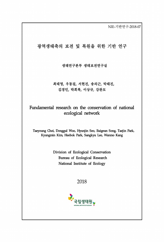NIE-기반연구-2018-07 광역생태축의 보전 및 복원을 위한 기반 연구 생태연구본부 생태보전연구실 최태영, 우동걸, 서현진, 송의근, 박태진, 김경민, 박희복, 이상규, 강완모 Fundamental research on the conservation of national ecological network Taeyoung Choi, Donggul Woo, Hyunjin Seo, Euigeun Song, Taejin Park, Kyungmin Kim, Heebok Park, Sangkyu Lee, Wanmo Kang Division of Ecological Conservation Bureau of Ecological Research National Institute of Ecology2018