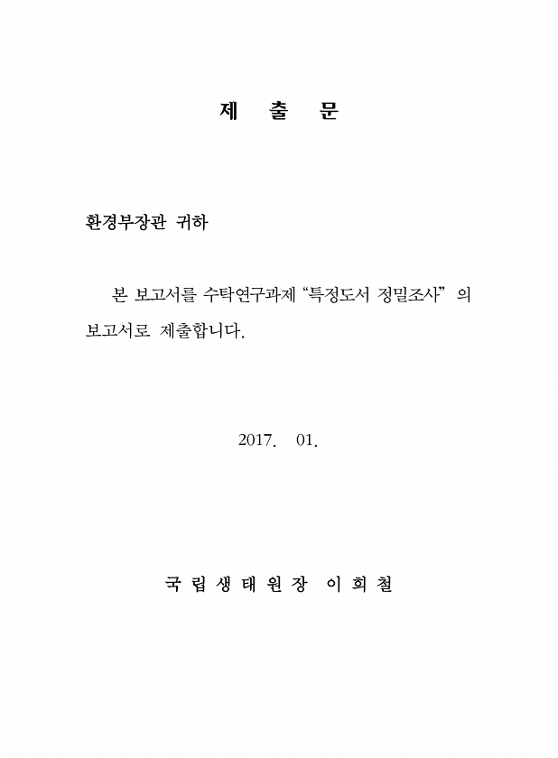 제 출 문 환경부장관 귀하 본 보고서를 수탁연구과제 “특정도서 정밀조사” 의 보고서로 제출합니다. 2017. 01. 국 립 생 태 원 장 이 희철