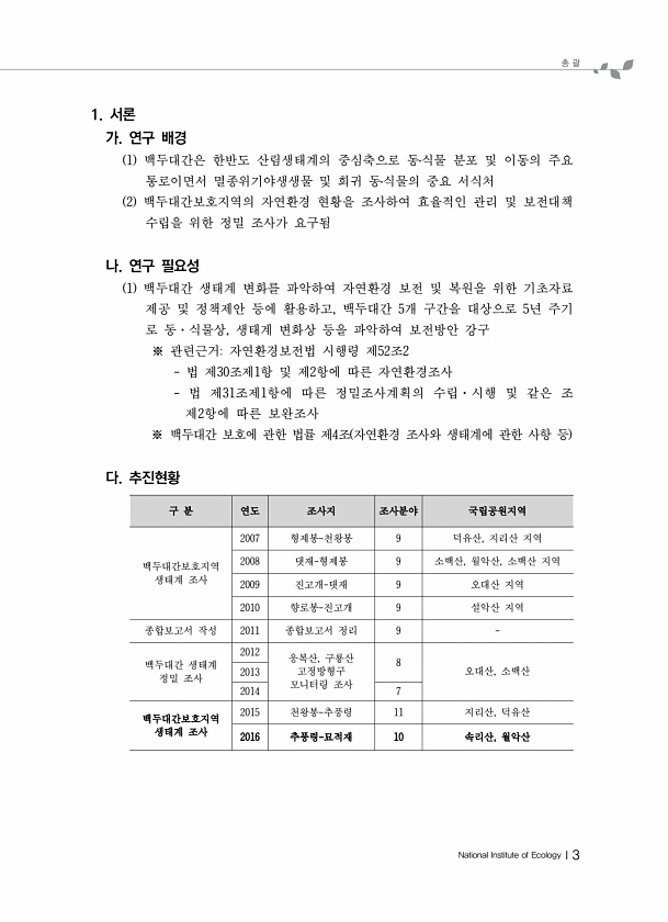 총 괄 National Institute of EcologyⅠ3 1. 서론 가. 연구 배경 1 백두대간은 한반도 산림생태계의 중심축으로 동?식물 분포 및 이동의 주요 통로이면서 멸종위기야생생물 및 희귀 동?식물의 중요 서식처 2 백두대간보호지역의 자연환경 현황을 조사하여 효율적인 관리 및 보전대책 수립을 위한 정밀 조사가 요구됨 나. 연구 필요성 1 백두대간 생태계 변화를 파악하여 자연환경 보전 및 복원을 위한 기초자료 제공 및 정책제안 등에 활용하고, 백두대간 5개 구간을 대상으로 5년 주기 로 동·식물상, 생태계 변화상 등을 파악하여 보전방안 강구 ※ 관련근거자연환경보전법 시행령 제52조2 법 제30조제1항 및 제2항에 따른 자연환경조사 법 제31조제1항에 따른 정밀조사계획의 수립·시행 및 같은 조 제2...