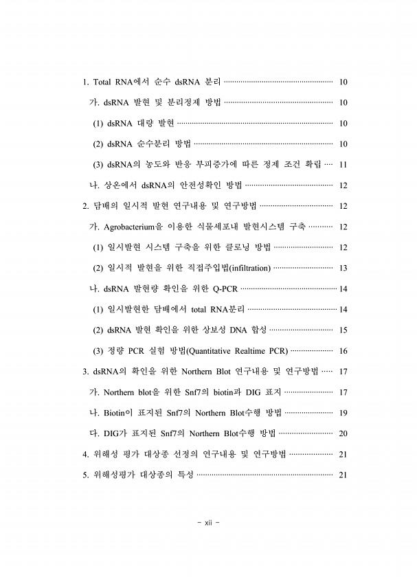 xii 1. Total RNA에서 순수 dsRNA 분리 ···················································· 10 가. dsRNA 발현 및 분리정제 방법 ··················································· 10 1 dsRNA 대량 발현 ·········································································· 10 2 dsRNA 순수분리 방법 ·································································· 10 3 dsRNA의 농도와 반응 부피증가에 따른 정제 조건 확립 ···· 11 나. 상온에서 dsRNA의 안...
