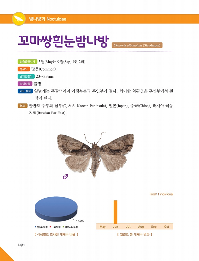 146 밤나방과 Noctuidae 성충출현시기 5월 May 9월 Sep 연 2회 풍부도 많음 Common 날개편길이 2333mm 먹이식물 불명 대표 형질 앞날개는 흑갈색이며 아랫부분과 후연부가 검다. 희미한 외횡선은 후연부에서 흰 점이 된다. 분포 한반도 중부와 남부 C. & S. Korean Peninsula , 일본 Japan , 중국 China , 러시아 극동 지역 Russian Far East 꼬마쌍흰눈밤나방 Chytonix albonotata Staudinger 【 월별로 본 개체수 변화 】 Total1 individual May Jun Jul Aug Sep Oct 【 식생별로 조사된 개체수 비율 】 100% 신갈나무림 소나무림아까시나무림