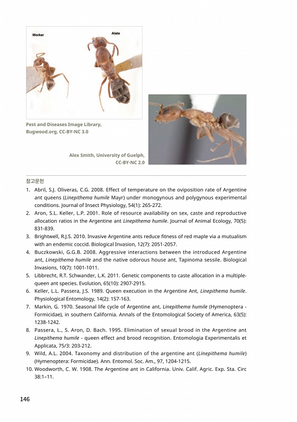 146 참고문헌 1. Abril, S.J. Oliveras, C.G. 2008. Effect of temperature on the oviposition rate of Argentine ant queens Linepithema humile Mayr under monogynous and polygynous experimental conditions. Journal of Insect Physiology, 54 1 265-272. 2. Aron, S.L. Keller, L.P. 2001. Role of resource availability on sex, caste and reproductive allocation ratios in the Argentine ant Linepithema humile. Journal...