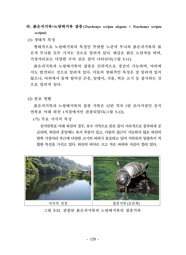 120 라. 붉은귀거북×노랑배거북 잡종 Trachemys scripta elegans × Trachemys scripta scripta 1 생태적 특성 형태적으로 노랑배거북의 특징인 뚜렷한 노란색 무늬와 붉은귀거북의 붉 은색 무늬를 모두 가지는 것으로 알려져 있다. 배갑은 밝은 노란색을 띠며, 가장자리로는 다양한 수의 검은 점이 나타난다 그림 5-11 붉은귀거북과 노랑배거북의 잡종은 인위적으로 생산이 가능하며, 야외에 서도 발견되는 것으로 알려져 있다. 이들의 생태적인 특성은 잘 알려져 있지 않으나, 야외에서 물에 떨어진 곤충, 달팽이, 식물, 썩은 고기 등 잡식하는 것 으로 알려져 있다. 2 분포 현황 붉은귀거북과 노랑배거북의 잡종 거북은 12번 격자 1번 조사지점인 천지 연폭포 아래 하천 1지점에서만 관...