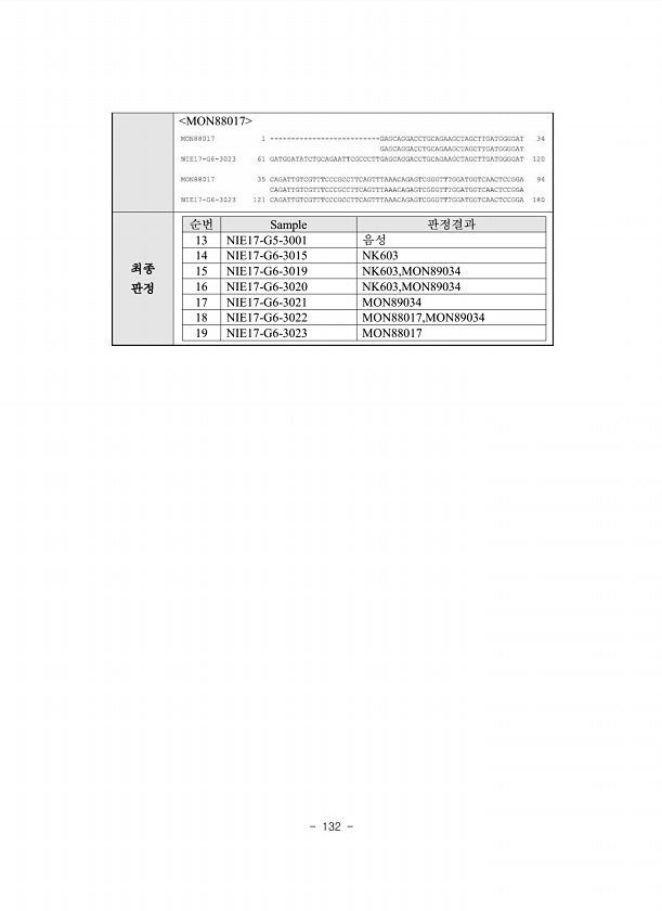132 MON88017 최종 판정 순번 Sample 판정결과 13 NIE17-G5-3001 음성 14 NIE17-G6-3015 NK603 15 NIE17-G6-3019 NK603,MON89034 16 NIE17-G6-3020 NK603,MON89034 17 NIE17-G6-3021 MON89034 18 NIE17-G6-3022 MON88017,MON89034 19 NIE17-G6-3023MON88017