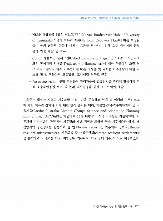 국내외 생태분야 기후변화 적응방안의 흐름과 발전방향 제3장 기후변화 영향 및 적응 연구 사례 129 NERP 해양생물다양성 허브 NERP Marine Biodiversity Hub University of Tasmania 국가 회복력 계획 National Recovery Plan 에 따른 보전활 동이 종의 회복력 향상에 미치는 효과를 평가하기 위해 호주 백상어의 군집 평가 기술 개발 및 적용 CSIRO 생물보안 플래그쉽 CSIRO Biosecurity Flagship 호주 도시근교의 도시 전이지역 외래종 Tradescantia fluminensis 에 대한 생물학적 조절 연 구 프로그램으로 미래 기후변화에 따른 자생종 및 외래종 이주경향에 대한 리 스크 평가, 생물학적 조절방안, 모니터링 연구로 구성 Par...