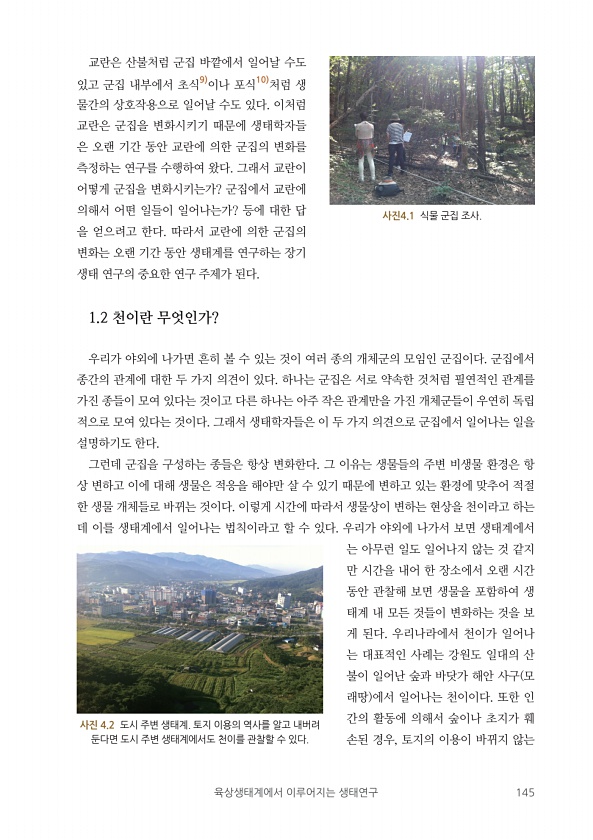 육상생태계에서 이루어지는 생태연구 145 교란은 산불처럼 군집 바깥에서 일어날 수도 있고 군집 내부에서 초식9 이나 포식10 처럼 생 물간의 상호작용으로 일어날 수도 있다. 이처럼 교란은 군집을 변화시키기 때문에 생태학자들 은 오랜 기간 동안 교란에 의한 군집의 변화를 측정하는 연구를 수행하여 왔다. 그래서 교란이 어떻게 군집을 변화시키는가? 군집에서 교란에 의해서 어떤 일들이 일어나는가? 등에 대한 답 을 얻으려고 한다. 따라서 교란에 의한 군집의 변화는 오랜 기간 동안 생태계를 연구하는 장기 생태 연구의 중요한 연구 주제가 된다. 1.2 천이란 무엇인가? 우리가 야외에 나가면 흔히 볼 수 있는 것이 여러 종의 개체군의 모임인 군집이다. 군집에서 종간의 관계에 대한 두 가지 의견이 있다. 하나는 군집은 서...