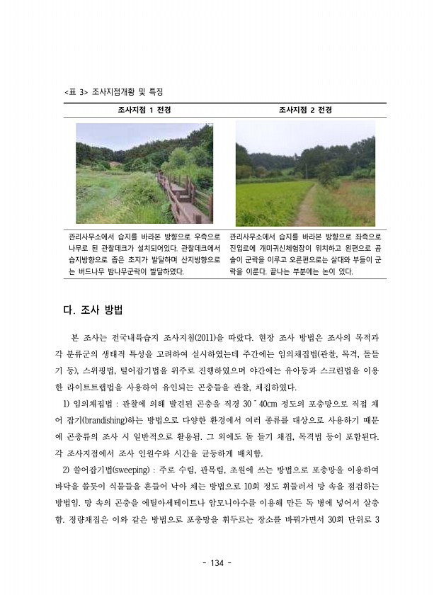 134 조사지점 1 전경 조사지점 2 전경 관리사무소에서 습지를 바라본 방향으로 우측으로 나무로 된 관찰데크가 설치되어있다. 관찰데크에서 습지방향으로 좁은 초지가 발달하며 산지방향으로 는 버드나무 밤나무군락이 발달하였다. 관리사무소에서 습지를 바라본 방향으로 좌측으로 진입로에 개미귀신체험장이 위치하고 왼편으로 곰 솔이 군락을 이루고 오른편으로는 살대와 부들이 군 락을 이룬다. 끝나는 부분에는 논이 있다. 표 3 조사지점개황 및 특징 다. 조사 방법 본 조사는 전국내륙습지 조사지침 2011 을 따랐다. 현장 조사 방법은 조사의 목적과 각 분류군의 생태적 특성을 고려하여 실시하였는데 주간에는 임의채집법 관찰, 목격, 돌들 기 등 , 스위핑법, 털어잡기법을 위주로 진행하였으며 야간에는 유아등과 스크린법을 이용 한...