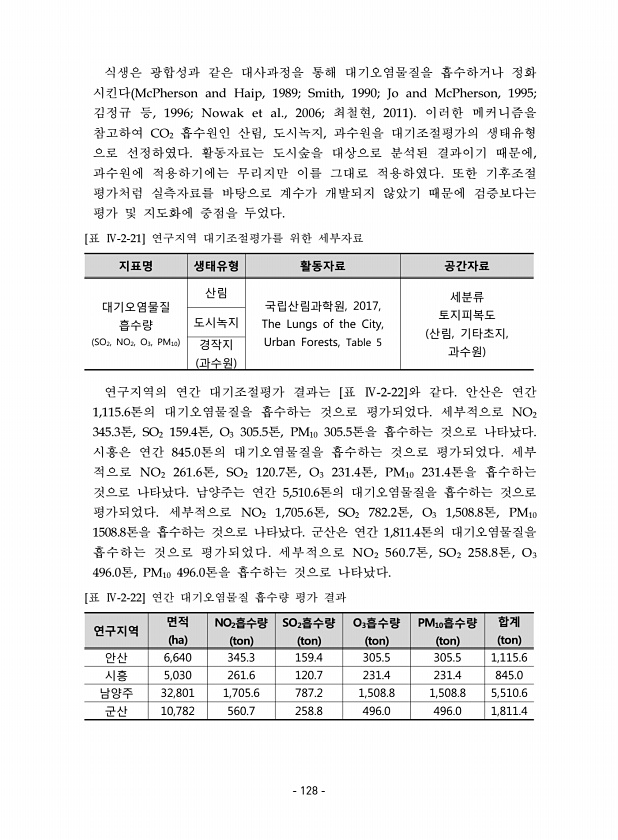 식생은 광합성과 같은 대사과정을 통해 대기오염물질을 흡수하거나 정화 시킨다 McPherson and Haip, 1989; Smith, 1990; Jo and McPherson, 1995; 김정규 등, 1996; Nowak et al., 2006; 최철현, 2011 이러한 메커니즘을 참고하여 CO2 흡수원인 산림, 도시녹지, 과수원을 대기조절평가의 생태유형 으로 선정하였다. 활동자료는 도시숲을 대상으로 분석된 결과이기 때문에, 과수원에 적용하기에는 무리지만 이를 그대로 적용하였다. 또한 기후조절 평가처럼 실측자료를 바탕으로 계수가 개발되지 않았기 때문에 검증보다는 평가 및 지도화에 중점을 두었다. 지표명 생태유형 활동자료 공간자료 대기오염물질 흡수량 SO2, NO2, O3, PM10 산림 국립산림과학원, 20...