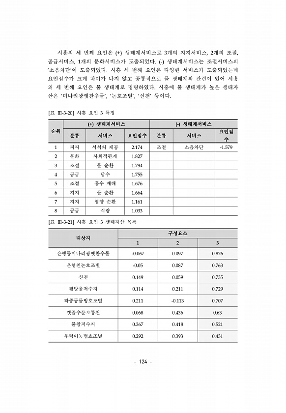 124 시흥의 세 번째 요인은 + 생태계서비스로 3개의 지지서비스, 2개의 조절, 공급서비스, 1개의 문화서비스가 도출되었다. 생태계서비스는 조절서비스의 ‘소음차단’이 도출되었다. 시흥 세 번째 요인은 다양한 서비스가 도출되었는데 요인점수가 크게 차이가 나지 않고 공통적으로 물 생태계와 관련이 있어 시흥 의 세 번째 요인은 물 생태계로 명명하였다. 시흥에 물 생태계가 높은 생태자 산은 ‘미나리꽝옛찬우물’, ‘논호조벌’, ‘신천’ 등이다. 순위 + 생태계서비스 생태계서비스 분류 서비스 요인점수 분류 서비스 요인점 수 1 지지 서식처 제공 2.174 조절 소음차단 -1.579 2 문화 사회적관계 1.827 3 조절 물 순환 1.794 4 공급 담수 1.755 5 조절 홍수 재해 1.676 6 지지 물 순환 1....