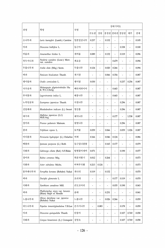 126 과명 학명 국명 상대기여도 수도권 강원 충청권 전라권 경상권 제주 전체 소나무과 Larix kaempferi Lamb. Carri?re 일본잎갈나무 0.237 0.132 0.105 마과 Dioscorea bulbifera L. 둥근마 0.338 0.100 비름과 Amaranthus lividus L. 개비름 0.089 0.132 0.119 0.096 꼭두서니과 Paederia scandens Lour. Merr. var. scandens 계요등 0.479 0.094 두릅나무과 Aralia elata Miq. Seem. 두릅나무 0.124 0.020 0.266 0.094 벼과 Panicum bisulcatum Thunb. 개기장 0.066 0.354 0.087 괭이밥과 Oxalis corniculata...