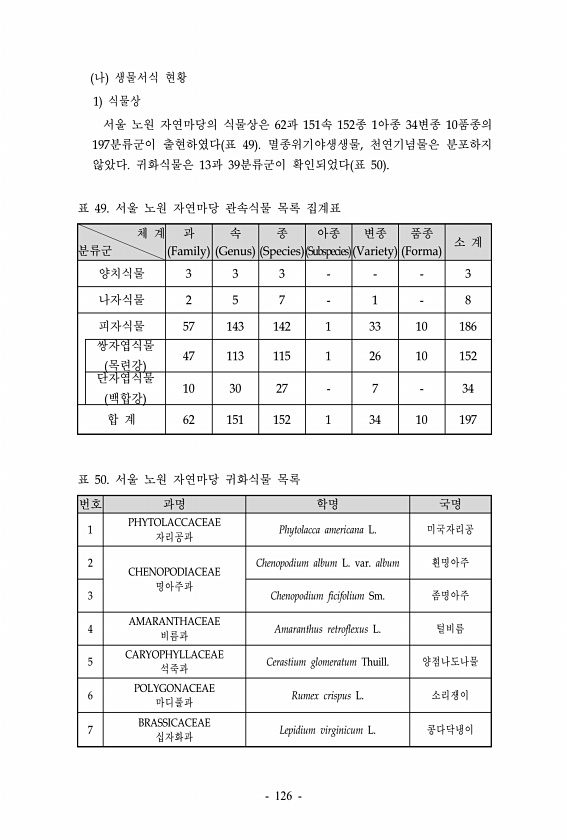 나 생물서식 현황 1 식물상 서울 노원 자연마당의 식물상은 62과 151속 152종 1아종 34변종 10품종의 197분류군이 출현하였다 표 49 멸종위기야생생물, 천연기념물은 분포하지 않았다. 귀화식물은 13과 39분류군이 확인되었다 표 50 체 계 분류군 과 Family 속 Genus 종 Species 아종 Subspecies 변종 Variety 품종 Forma 소 계 양치식물 3 3 3 3 나자식물 2 5 7 1 8 피자식물 57 143 142 1 33 10 186 쌍자엽식물 목련강 47 113 115 1 26 10 152 단자엽식물 백합강 10 30 27 7 34 합 계 62 151 152 1 34 10 197 표 49. 서울 노원 자연마당 관속식물 목록 집계표 번호 과명 학명 국명 1 PHYTOLAC...