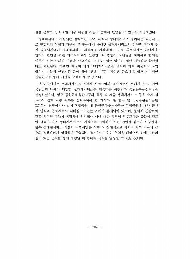 784 들을 분석하고, 요소별 세부 내용을 지침 수준에서 반영할 수 있도록 제안하였다. 생태계서비스 지불제는 정책수단으로서 과학적 생태계서비스 평가와는 직접적으 로 연결되기 어렵기 때문에 본 연구에서 수행한 생태계서비스의 정량적 평가와 추 정 지불의사액이 생태계서비스 지불제의 지불액의 근거로 활용되기는 어렵지만, 합리적 판단을 위한 기초자료로서 선행연구와 경험적 사례들을 지지하고 합의를 이루기 위한 사회적 비용을 감소시킬 수 있는 접근 방식의 개선 가능성을 확인했 다고 판단된다. 하지만 여전히 거래 생태계서비스를 명확히 하여 지불제의 사업 방식과 지불액 산정기준 등의 계약내용을 다듬는 작업은 중요하며, 향후 지속적인 실증연구를 통해 개선을 모색해야 할 것이다. 본 연구에서는 생태계서비스 지불제 시범사업의 대...
