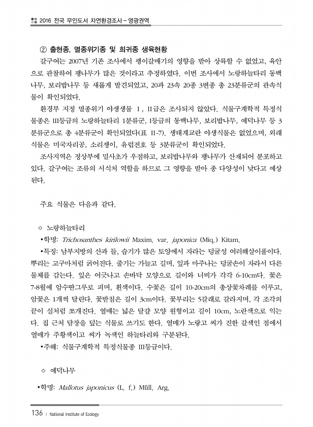 2016 전국 무인도서 자연환경조사 영광권역 136 ? National Institute of Ecology ② 출현종, 멸종위기종 및 희귀종 생육현황 갈구여는 2007년 기존 조사에서 괭이갈매기의 영향을 받아 상륙할 수 없었고, 육안 으로 관찰하여 팽나무가 많은 것이라고 추정하였다. 이번 조사에서 노랑하늘타리 동백 나무, 보리밥나무 등 새롭게 발견되었고, 20과 23속 20종 3변종 총 23분류군의 관속식 물이 확인되었다. 환경부 지정 멸종위기 야생생물 Ⅰ, Ⅱ급은 조사되지 않았다. 식물구계학적 특정식 물종은 III등급의 노랑하늘타리 1분류군, I등급의 동백나무, 보리밥나무, 예덕나무 등 3 분류군으로 총 4분류군이 확인되었다 표 Ⅱ-7 생태계교란 야생식물은 없었으며, 외래 식물은 미국자리공, 소리쟁이, ...