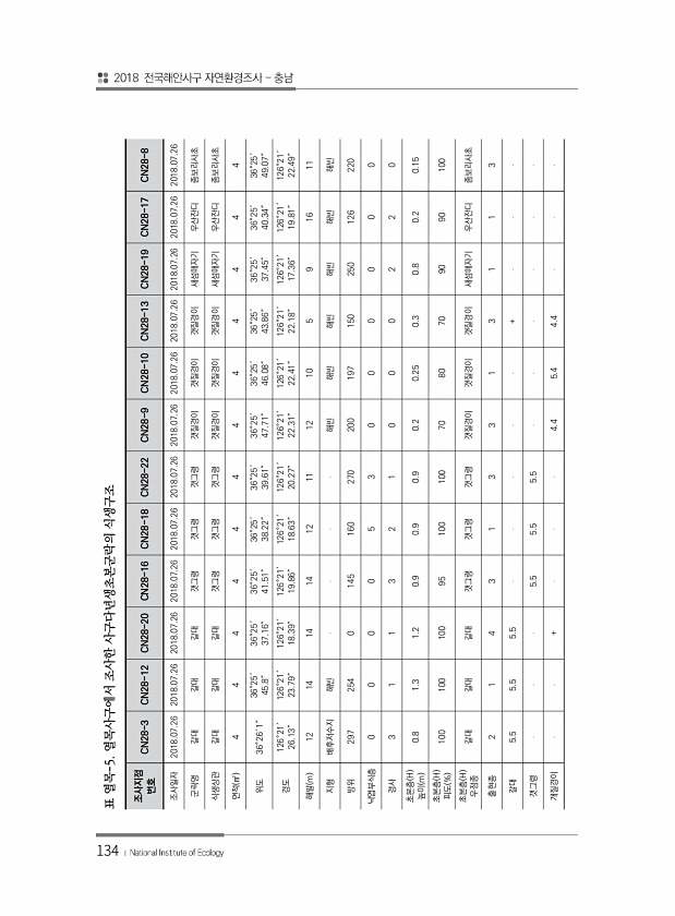 134 조사지점 번호 CN28-3 CN28-12 CN28-20 CN28-16 CN28-18 CN28-22 CN28-9 CN28-10 CN28-13 CN28-19 CN28-17 CN28-8 조사일자 2018.07.26 2018.07.26 2018.07.26 2018.07.26 2018.07.26 2018.07.26 2018.07.26 2018.07.26 2018.07.26 2018.07.26 2018.07.26 2018.07.26 군락명 갈대 갈대 갈대 갯그령 갯그령 갯그령 갯질경이 갯질경이 갯질경이 새섬매자기 우산잔디 좀보리사초 식생상관 갈대 갈대 갈대 갯그령 갯그령 갯그령 갯질경이 갯질경이 갯질경이 새섬매자기 우산잔디 좀보리사초 면적 ㎡ 4 4 4 4 4 4 4 4 4 4 4 4 위도 36°26′1″ 36...