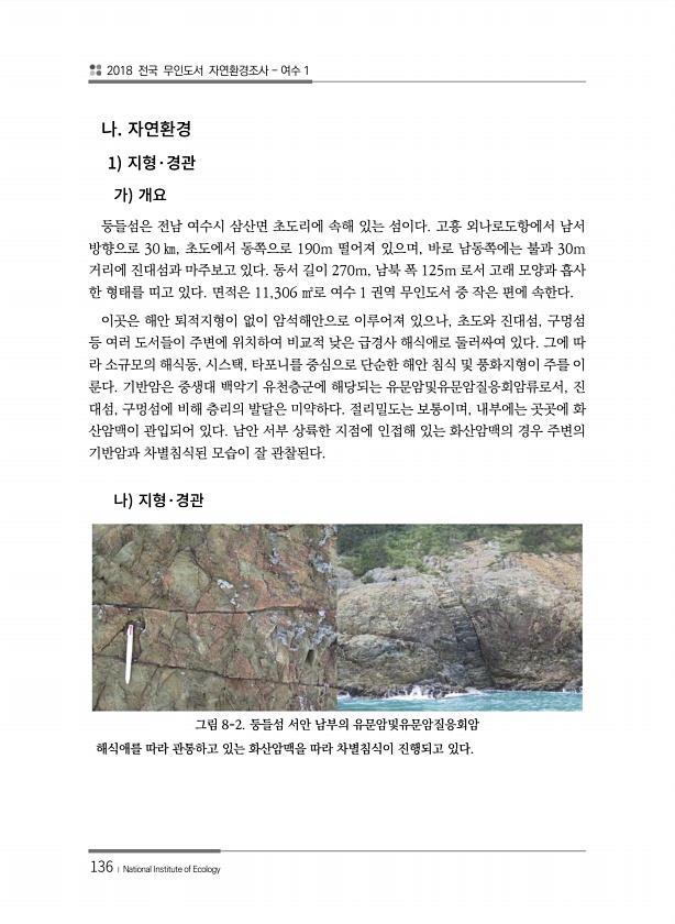 2018 전국 무인도서 자연환경조사 여수 1 136 ? National Institute of Ecology 1 · 둥들섬은 전남 여수시 삼산면 초도리에 속해 있는 섬이다. 고흥 외나로도항에서 남서 방향으로 30 ㎞, 초도에서 동쪽으로 190m 떨어져 있으며, 바로 남동쪽에는 불과 30m 거리에 진대섬과 마주보고 있다. 동서 길이 270m, 남북 폭 125m 로서 고래 모양과 흡사 한 형태를 띠고 있다. 면적은 11,306 ㎡로 여수 1 권역 무인도서 중 작은 편에 속한다. 이곳은 해안 퇴적지형이 없이 암석해안으로 이루어져 있으나, 초도와 진대섬, 구멍섬 등 여러 도서들이 주변에 위치하여 비교적 낮은 급경사 해식애로 둘러싸여 있다. 그에 따 라 소규모의 해식동, 시스택, 타포니를 중심으로 단순한 해안 침식 ...