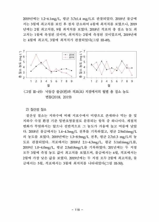 118 2019년에는 1.26.1mg/L, 평균 3.7±1.4 mg/L로 관찰되었다. 2018년 물금에 서는 3월에 최고치를 보인 후 점차 감소하여 6월에 최저치를 보였으나, 2019 년에는 2월 최고치를, 9월 최저치를 보였다. 2018년 적포의 총 질소 농도 최 고치는 1월에 측정된 것이며, 최저치는 2월에 측정된 것이었으며, 2019년에 는 4월에 최고치, 3월에 최저치가 관찰되었다 그림 III-49 그림 Ⅲ-49 낙동강 물금 왼 과 적포 오 지점에서의 월별 총 질소 농도 변동 2018, 2019 2 질산성 질소 질산성 질소는 지하수에 비해 지표수에서 미량으로 존재하나 먹는 물 및 지하수 수질 환경 기준 일반오염물질로 분류되는 항목 중 하나이다. 계절적 변화가 뚜렷하지는 않으나 전반적으로 그 농도가 겨...