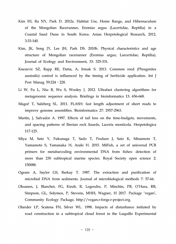 Kim IH, Ra NY, Park D. 2012a. Habitat Use, Home Range, and Hibernaculum of the Mongolian Racerunner, Eremias argus Lacertidae, Reptilia in a Coastal Sand Dune in South Korea. Asian Herpetological Research, 2012, 333-140. Kim, JK, Song JY, Lee JH, Park DS. 2010b. Physical characteristics and age structure of Mongolian racerunner Eremias argus; Larcertidae; Reptilia Journal of Ecology and Environmen...