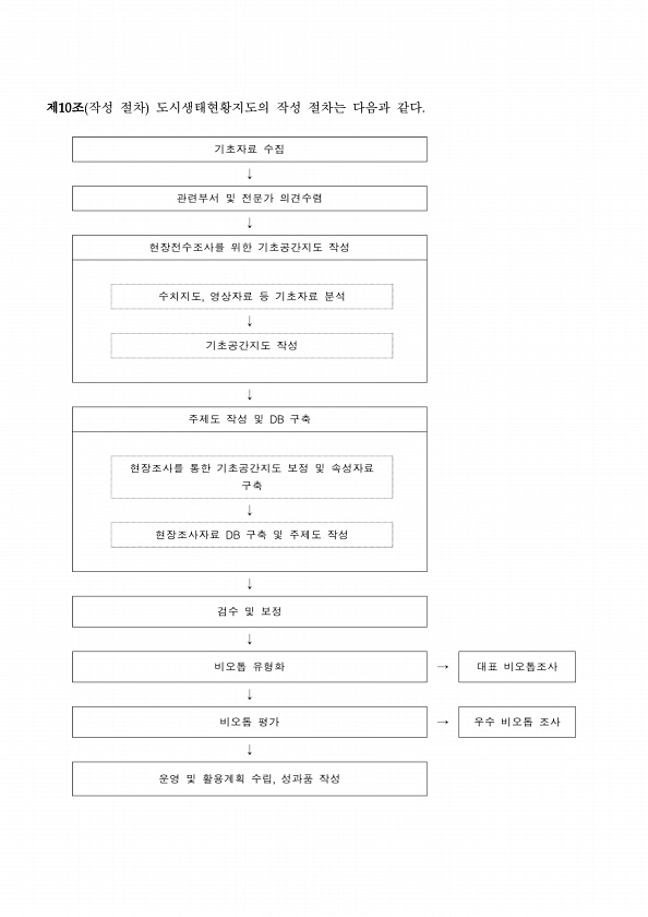 제10조 작성 절차 도시생태현황지도의 작성 절차는 다음과 같다. 기초자료 수집 ↓ 관련부서 및 전문가 의견수렴 ↓ 현장전수조사를 위한 기초공간지도 작성 수치지도, 영상자료 등 기초자료 분석 ↓ 기초공간지도 작성 ↓ 주제도 작성 및 DB 구축 현장조사를 통한 기초공간지도 보정 및 속성자료 구축 ↓ 현장조사자료 DB 구축 및 주제도 작성 ↓ 검수 및 보정 ↓ 비오톱 유형화 → 대표 비오톱조사 ↓ 비오톱 평가 → 우수 비오톱 조사 ↓ 운영 및 활용계획 수립, 성과품작성