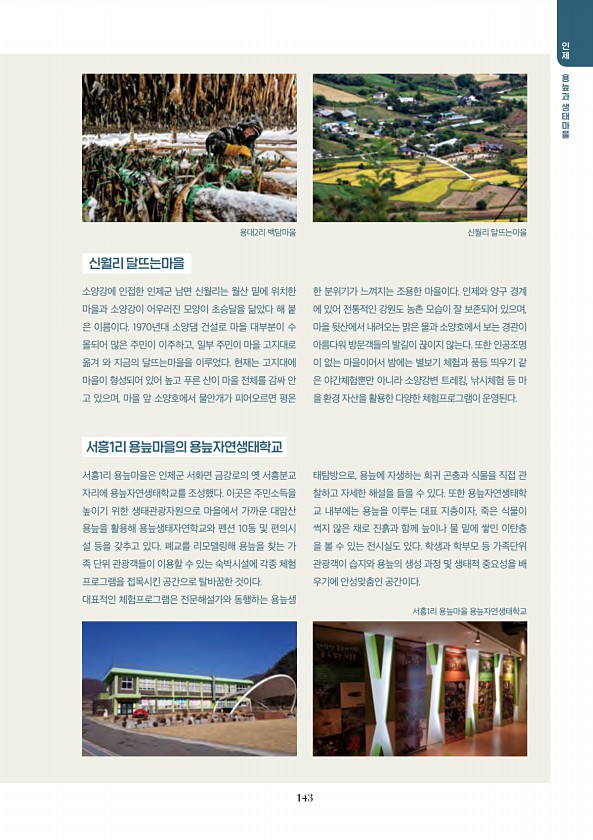143 인제 용 용 용 용용 용 용 용 용대2리 백담마을 신월리 달뜨는마을 서흥1리 용늪마을 용늪자연생태학교 소양강에 인접한 인제군 남면 신월리는 월산 밑에 위치한 마을과 소양강이 어우러진 모양이 초승달을 닮았다 해 붙 은 이름이다. 1970년대 소양댐 건설로 마을 대부분이 수 몰되어 많은 주민이 이주하고, 일부 주민이 마을 고지대로 옮겨 와 지금의 달뜨는마을을 이루었다. 현재는 고지대에 마을이 형성되어 있어 높고 푸른 산이 마을 전체를 감싸 안 고 있으며, 마을 앞 소양호에서 물안개가 피어오르면 평온 신월리 달뜨는마을 한 분위기가 느껴지는 조용한 마을이다. 인제와 양구 경계 에 있어 전통적인 강원도 농촌 모습이 잘 보존되어 있으며, 마을 뒷산에서 내려오는 맑은 물과 소양호에서 보는 경관이 아름다워 방문객들...