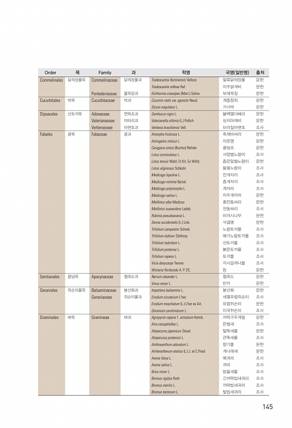 145 Commelinales 닭의장풀목 Commelinaceae 닭의장풀과 Tradescantia fuminensis Vellozo 얼룩닭의장풀 문헌 Tradescantia refexa Raf. 자주닭개비 문헌 Pontederiaceae 물옥잠과 Eichhornia crassipes Mart. Solms 부레옥잠 문헌 Cucurbitales 박목 Cucurbitaceae 박과 Cucumis melo var. agrestis Neud. 개똥참외 문헌 Sicyos angulatus L. 가시박 문헌 Dipsacales 산토끼목 Adoxaceae 연복초과 Sambucus nigra L. 블랙엘더베리 문헌 Valerianaceae 마타리과 Valerianella olitoria L. Pollich 상치아재비 문헌...