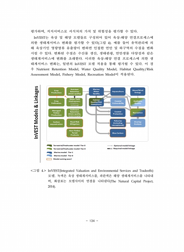134 평가하며 지지서비스로 서식처의 가치 및 위험성을 평가할 수 있다 는 육상 및 해양 모델들로 구성되어 있어 육상 해양 연결프로세스에 의한 생태계서비스 변화를 평가할 수 있다 그림 예를 들어 유역관리에 의 해 육상기인 영량염류 유출량이 변하면 인접한 연안 및 하구역의 수질을 변화 시킬 수 있다 변화된 수질은 수산물 생산 생태관광 연안생물 다양성과 같은 생태계서비스에 변화를 초래한다 이러한 육상 해양 연결 프로세스에 의한 생 태계서비스 변화는 일련의 모델 적용을 통해 평가될 수 있다 이 경 우 이 적용된다 그림 모델 녹색은 육상 생태계서비스를 파란색은 해양 생태계서비스를 나타내 며 화살표는 모델사이의 연결을나타낸다