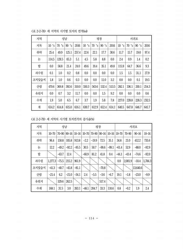 114 지역 성남 평창 서귀포 지목 10‘s 70‘s 90‘s 2016 10‘s 70‘s 90‘s 2016 10‘s 70‘s 90‘s 2016 취락 25.4 49.9 125.1 257.4 22.6 22.1 17.7 30.6 11.7 15.7 19.0 97.4 논 114.5 128.5 65.3 5.1 4.5 5.8 8.8 0.0 2.4 0.9 1.4 0.2 밭 0.0 58.8 21.4 24.0 49.6 19.4 35.1 49.8 115.9 64.7 36.6 9.3 과수원 0.1 1.0 0.2 0.8 0.0 0.0 0.0 0.0 1.5 1.5 31.1 27.9 초지및습지 1.8 1.0 0.6 0.3 0.0 0.0 11.0 3.2 0.0 0.0 0.1 19.5 산림 470.6 369.8 392.6 310.0 55...