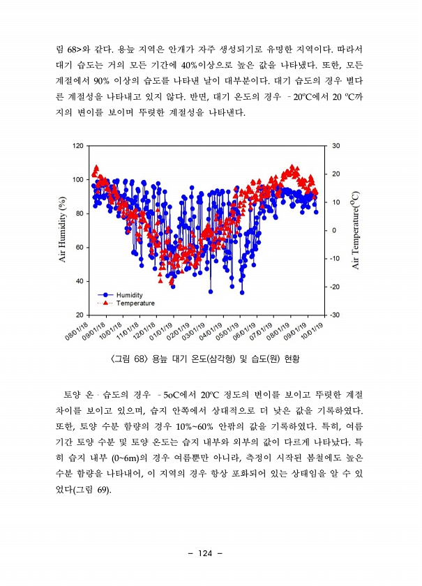 124 림 68 와 같다. 용늪 지역은 안개가 자주 생성되기로 유명한 지역이다. 따라서 대기 습도는 거의 모든 기간에 40%이상으로 높은 값을 나타냈다. 또한, 모든 계절에서 90% 이상의 습도를 나타낸 날이 대부분이다. 대기 습도의 경우 별다 른 계절성을 나타내고 있지 않다. 반면, 대기 온도의 경우 ?20oC에서 20 oC까 지의 변이를 보이며 뚜렷한 계절성을 나타낸다. 그림 68 용늪 대기 온도 삼각형 및 습도 원 현황 토양 온?습도의 경우 ?5oC에서 20oC 정도의 변이를 보이고 뚜렷한 계절 차이를 보이고 있으며, 습지 안쪽에서 상대적으로 더 낮은 값을 기록하였다. 또한, 토양 수분 함량의 경우 10%60% 안팎의 값을 기록하였다. 특히, 여름 기간 토양 수분 및 토양 온도는 습지 내부와 외부의 값...