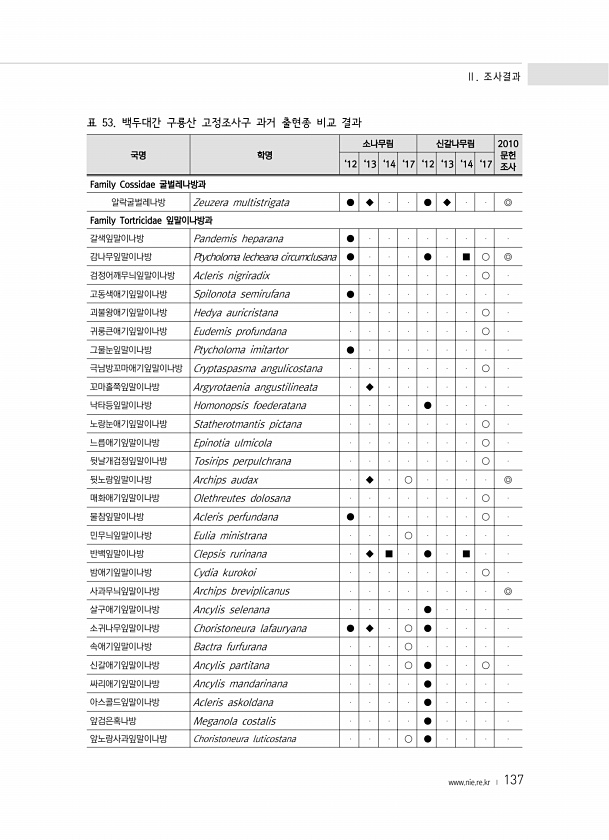Ⅱ. 조사결과 www.nie.re.kr ? 137 표 53. 백두대간 구룡산 고정조사구 과거 출현종 비교 결과 국명 학명 소나무림 신갈나무림 2010 문헌 ‘12 ‘13 ‘14 ‘17 ‘12 ‘13 ‘14 ‘17 조사 Family Cossidae 굴벌레나방과 알락굴벌레나방 Zeuzera multistrigata ● ◆ ● ◆ ◎ Family Tortricidae 잎말이나방과 갈색잎말이나방 Pandemis heparana ● 감나무잎말이나방 Ptycholoma lecheana circumclusana ● ● ■ ○ ◎ 검정어깨무늬잎말이나방 Acleris nigriradix ○ 고동색애기잎말이나방 Spilonota semiru...