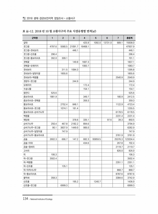 2018 생태·경관보전지역 정밀조사 소황사구 134 ? National Institute of Ecology 군락명 1 2 3 4 5 6 7 총합계 갈대 425.9 1092.0 13731.0 689.1 15938.0 갯그령 4797.6 5580.5 21091.7 16468.1 47937.9 갯그령-갯쇠보리 446.1 446.1 갯그령-산조풀 296.4 296.4 갯그령-통보리사초 392.0 309.1 701.1 갯메꽃 149.8 1687.3 1837.1 갯메꽃-모래지치 1083.7 1083.7 갯쇠보리 311.5 1084.3 1395.8 갯쇠보리-달맞이꽃 1855.6 1855.6 갯쇠보리-백령풀 2540.9 2540.9 갯완두-갯그령 244.9 244.9 모래지치 172.4 172.4 수송나물 154.1 1...