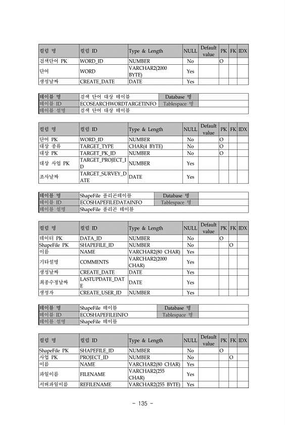 135 컬럼 명 컬럼 ID Type & Length NULL Default value PK FK IDX 검색단어 PK WORD_ID NUMBER No O 단어 WORD VARCHAR2 2000 BYTE Yes 생성날짜 CREATE_DATE DATE Yes 테이블 명 검색 단어 대상 테이블 Database 명 테이블 ID ECOSEARCHWORDTARGETINFO Tablespace 명 테이블 설명 검색 단어 대상 테이블 컬럼 명 컬럼 ID Type & Length NULL Default value PK FK IDX 단어 PK WORD_ID NUMBER No O 대상 종류 TARGET_TYPE CHAR 4 BYTE No O 대상 PK TARGET_PK_ID NUMBER No O 대상 사업 PK TARGET_P...