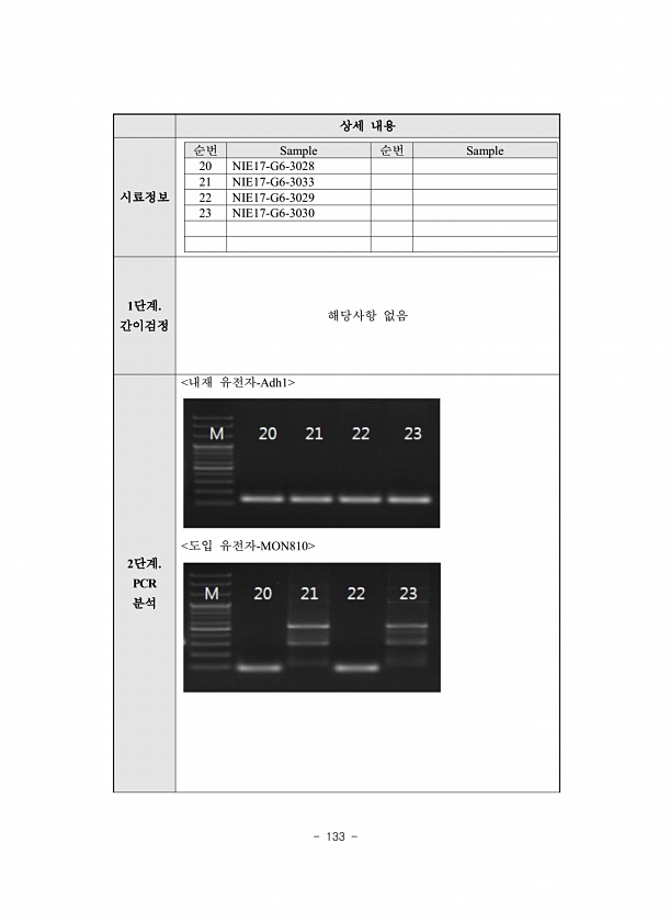 133 상세 내용 시료정보 순번 Sample 순번 Sample 20 NIE17-G6-3028 21 NIE17-G6-3033 22 NIE17-G6-3029 23 NIE17-G6-3030 1단계. 간이검정 해당사항 없음 2단계. PCR 분석 내재 유전자-Adh1 도입 유전자-MON810