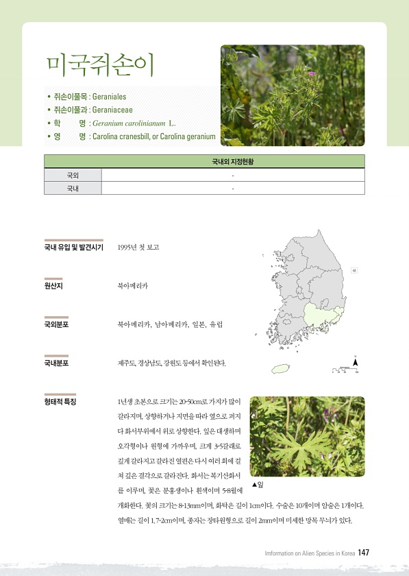 포유류 양서류 · 파충류 담수어류 곤충류 연체동물 외래식물 Imformation on Alien Species in Korea 147 국내 유입 및 발견시기 1995년 첫 보고 원산지 북아메리카 국외분포 북아메리카, 남아메리카, 일본, 유럽 국내분포 제주도, 경상남도, 강원도 등에서 확인된다. 형태적 특징 1년생 초본으로 크기는 20-50cm로 가지가 많이 갈라지며, 상향하거나 지면을 따라 옆으로 퍼지 다 화서부위에서 위로 상향한다. 잎은 대생하며 오각형이나 원형에 가까우며, 크게 3-5갈래로 깊게 갈라지고 갈라진 열편은 다시 여러 회에 걸 쳐 깊은 결각으로 갈라진다. 화서는 복기산화서 를 이루며, 꽃은 분홍생이나 흰색이며 5-8월에 개화한다. 꽃의 크기는 8-13mm이며, 화탁은 길이 1cm이다. 수술은 ...