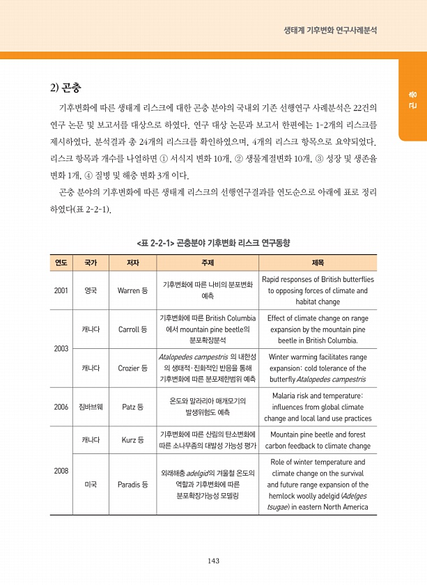 143 생태계 기후변화 연구사례분석 곤 충 2 곤충 기후변화에 따른 생태계 리스크에 대한 곤충 분야의 국내외 기존 선행연구 사례분석은 22건의 연구 논문 및 보고서를 대상으로 하였다. 연구 대상 논문과 보고서 한편에는 1-2개의 리스크를 제시하였다. 분석결과 총 24개의 리스크를 확인하였으며, 4개의 리스크 항목으로 요약되었다. 리스크 항목과 개수를 나열하면 ① 서식지 변화 10개, ② 생물계절변화 10개, ③ 성장 및 생존율 변화 1개, ④ 질병 및 해충 변화 3개 이다. 곤충 분야의 기후변화에 따른 생태계 리스크의 선행연구결과를 연도순으로 아래에 표로 정리 하였다 표 2-2-1 표 2-2-1 곤충분야 기후변화 리스크 연구동향 연도 국가 저자 주제 제목 2001 영국 Warren 등 기후변화에 따른 나비의...