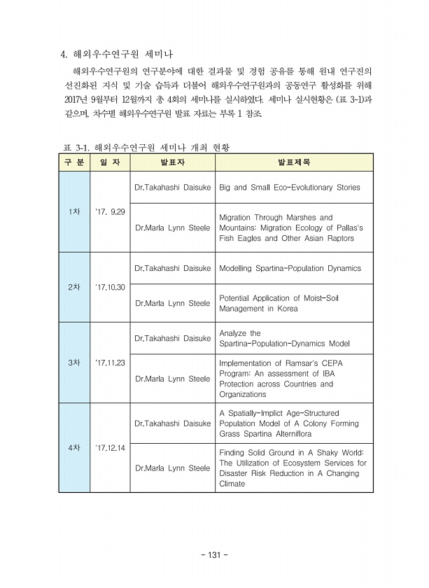 131 4. 해외우수연구원 세미나 해외우수연구원의 연구분야에 대한 결과물 및 경험 공유를 통해 원내 연구진의 선진화된 지식 및 기술 습득과 더불어 해외우수연구원과의 공동연구 활성화를 위해 2017년 9월부터 12월까지 총 4회의 세미나를 실시하였다. 세미나 실시현황은 표 3-1 과 같으며, 차수별 해외우수연구원 발표 자료는 부록 1 참조. 표 해외우수연구원 세미나 개최 현황 131