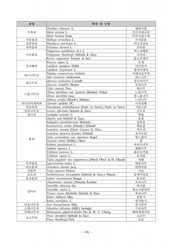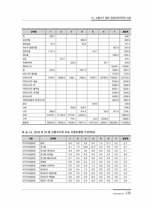 iii. 소황사구 생태·경관보전지역의 식생 www.nie.re.kr ?135 군락명 1 2 3 4 5 6 7 총합계 쑥 438.7 438.7 큰김의털 869.0 869.0 환삼덩굴 87.9 63.6 151.4 비수리-달맞이꽃 567.8 567.8 달맞이꽃 1141.2 142.7 1283.8 돼지풀 1384.3 1384.3 망초 473.1 473.1 족제비싸리 220.5 45.1 265.6 참싸리-띠 15448.1 15448.1 칡 229.2 1827.3 1894.4 3951.0 버드나무-왕버들 1570.0 1570.0 아까시나무 4709.4 13886.5 7382.1 2584.2 13387.7 20786.9 170056.1 232792.9 아까시나무-곰솔 8184.0 8184.0 아까시나무-띠 5386.6 ...