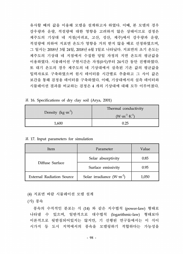 98 유사할 때의 값을 이용해 모델을 설계하고자 하였다. 이때, 본 모델의 경우 강우량과 운량, 적설량에 대한 영향을 고려하지 않은 상태이므로 검정은 제주도의 기상대 네 지점 서귀포, 고산, 성산, 제주 에서 강우량과 운량, 적설량에 의하여 지표면 온도가 영향을 거의 받지 않을 때로 선정하였으며, 그 일시는 2018년 3월 24일, 2018년 6월 1일로 나타났다. 지표면의 초기 온도는 제주도의 기상대 네 지점에서 수집한 당일 자정의 지면 온도의 평균값을 이용하였다. 시뮬레이션 구현시간은 자정 0시 부터 24시간 동안 진행하였다. 또 대기 온도의 경우 제주도의 네 기상대에서 실측된 기온 값의 평균값을 입력자료로 구축하였으며 원시 데이터를 시간별로 추출하고 그 사이 값은 보간을 통해 검정용 데이터를 구축하였다...