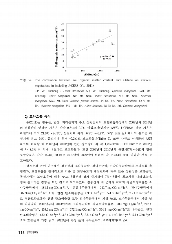그림 54. The correlation between soil organic matter content and altitude on various vegetations in including J-CERS Yu, 2011 SPMt. Jumbong Pinus densiflora, SQMt. Jumbong, Quercus mongolica, SAHMt. Jumbong, Abies holophylla, NPMt. Nam, Pinus densiflora, NQMt. Nam, Quercus mongolica, NACMt. Nam, Robinia pseudo-acacia, JPMt. Jiri, Pinus densiflora, JQ-SMt. Jiri, Quercus mongolica, JAK Mt. Jiri, Abies...