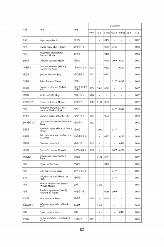 127 과명 학명 국명 상대기여도 수도권 강원 충청권 전라권 경상권 제주 전체 박과 Sicyos angulatus L. 가시박 0.198 0.052 벼과 Setaria glauca L. P.Beauv. 금강아지풀 0.099 0.133 0.052 벼과 Miscanthus sacchariflorus Maxim. Benth. 물억새 0.198 0.052 꿀풀과 Leonurus japonicus Houtt. 익모초 0.099 0.089 0.030 0.052 마디풀과 Persicaria senticosa H.Gross ex Nakai Meisn. 며느리밑씻개 0.024 0.132 0.024 0.049 메꽃과 Ipomoea hederacea Jacq. 미국나팔꽃 0.047 0.132 0.049 장미과 Rubus hir...