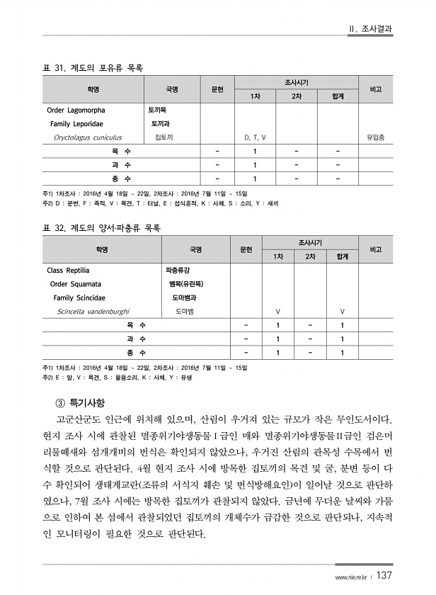 Ⅱ. 조사결과 www.nie.re.kr ? 137 표 31. 계도의 포유류 목록 학명 국명 문헌 조사시기 비고 1차 2차 합계 Order Lagomorpha 토끼목 Family Leporidae 토끼과 Oryctolagus cuniculus 집토끼 D, T, V 유입종 목 수 1 과 수 1 종 수 1 주1 1차조사 2016년 4월 18일 22일, 2차조사 2016년 7월 11일 15일 주2 D 분변, F 족적, V 목견, T 터널, E 섭식흔적, K 사체, S 소리, Y 새끼 표 32. 계도의 양서?파충류 목록 학명 국명 문헌 조사시기 비고 1차 2차 합계 Class Reptilia 파충류강 Order Squamata 뱀목 유린목 Family Scincidae 도마뱀과 Scincella vandenburgh...