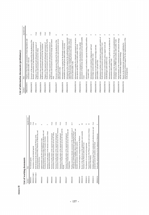 Annex II List of working documents Symbol Title Agenda item IPBES/6/1 Provisional agenda 2 a IPBES/6/1/Add.1 Annotations to the provisional agenda 2 a IPBES/6/1/Add.2 Draft decisions for the sixth session of the Plenary of the Intergovernmental Science-Policy Platform on Biodiversity and Ecosystem Services 14 IPBES/6/2 Implementation of the first work programme of the Intergovernmental Science-Pol...